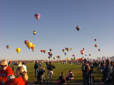 We woke up early...but not early enough. Even though I was up at 5 am we still missed the end of mass ascension by about 10 minutes. We were lucky though because the last balloon to go up was Darth Vader and Blaise was quite excited about that. It was the special shapes day and we were able to watch all the shapes...energizer bunny, champagne bottle, bee, dinosaur, etc. Then the regular balloons flew right over and just seemed to keep coming. The movement in the sky was spectacular. I was not sure it would be this great but I was not disappointed and I am already looking forward to next year (I will get up at 4 am though).